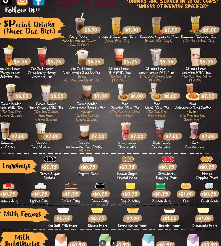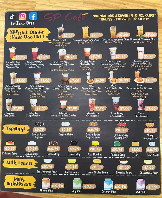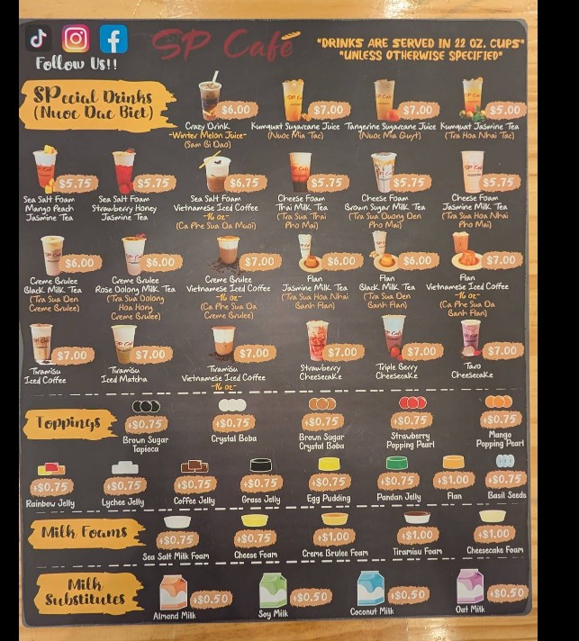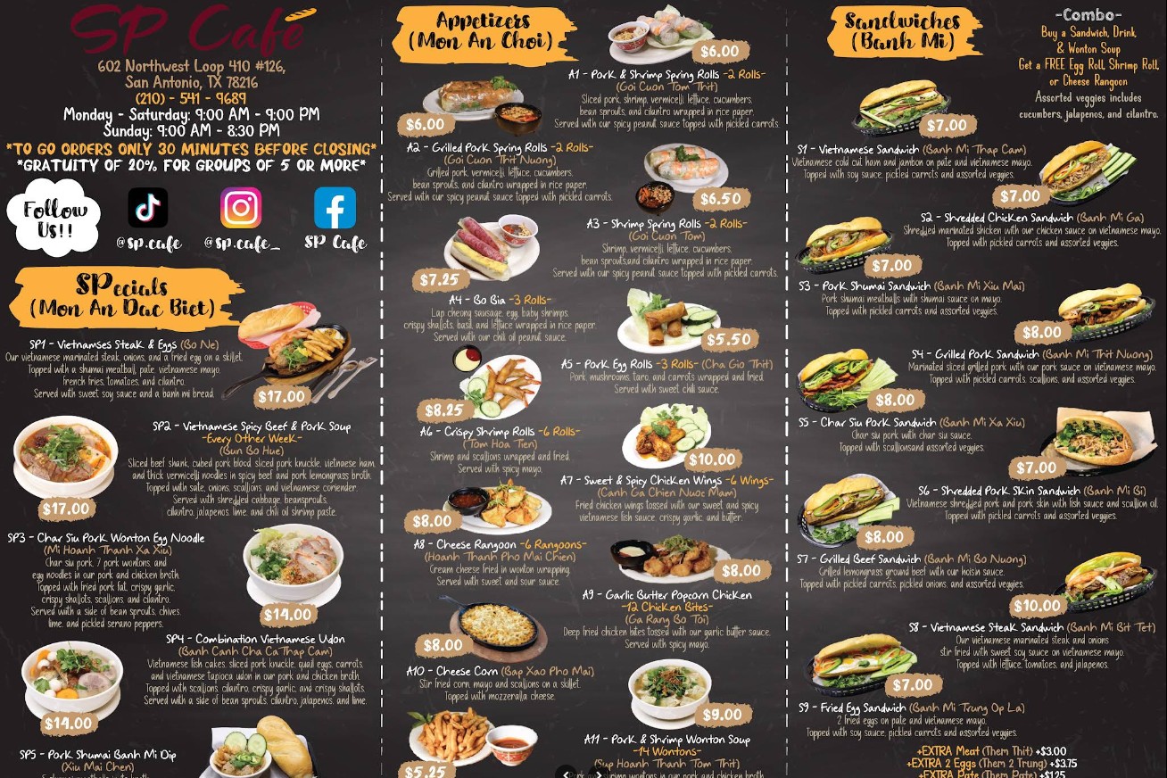 Welcome to SP Café Restaurant, your go-to destination for fresh flavors and a modern café experience in San Antonio. Our carefully crafted menu features delicious Vietnamese sandwiches, freshly baked pastries, rich espresso drinks, and refreshing smoothies. Whether you're stopping by for a quick coffee or a satisfying meal, the Fiore SP Café Restaurant menu offers something for everyone. Enjoy quality ingredients, cozy ambiance, and a taste you’ll keep coming back for.